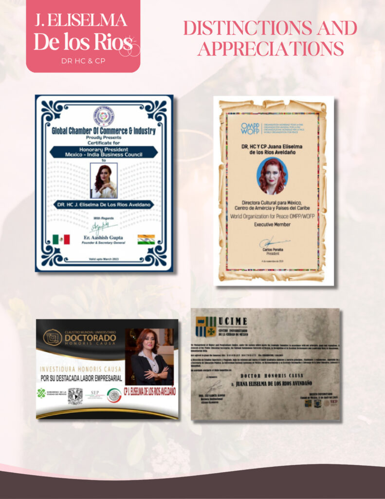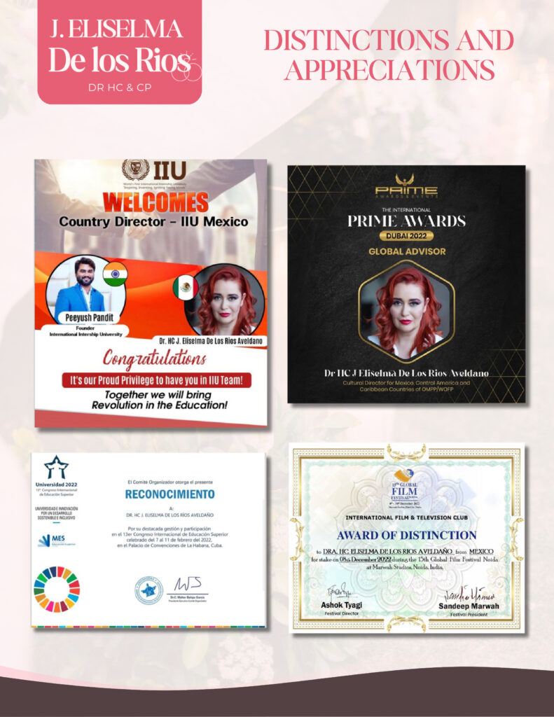 FUNDAMEX (Foundation Alliance for Health in Mexico) Delegate of Women’s Health for Mexico and the World, A.C. Association. Delegate Durango AHANAOA, A.C. and Hispanoamerican association Orthomolecular and Anti-aging Member A4M of The American Academy of Anti Aging “Innovating with an open mind” 3D Representative of AACCI in MEXICO in INDIA 2023-2025 Awarded distinction during the 15th Global Film Festival Noida at Marwah Studios, Noida, India, in 2022. Country Director of the International Internship University (2023-2026). Recognition by the Ministry of Higher Education of the Republic of Cuba for signing an agreement with 22 universities in Mexico focused on technology. Prime Awards Dubai 2022 Winner in the Arts and Culture category.