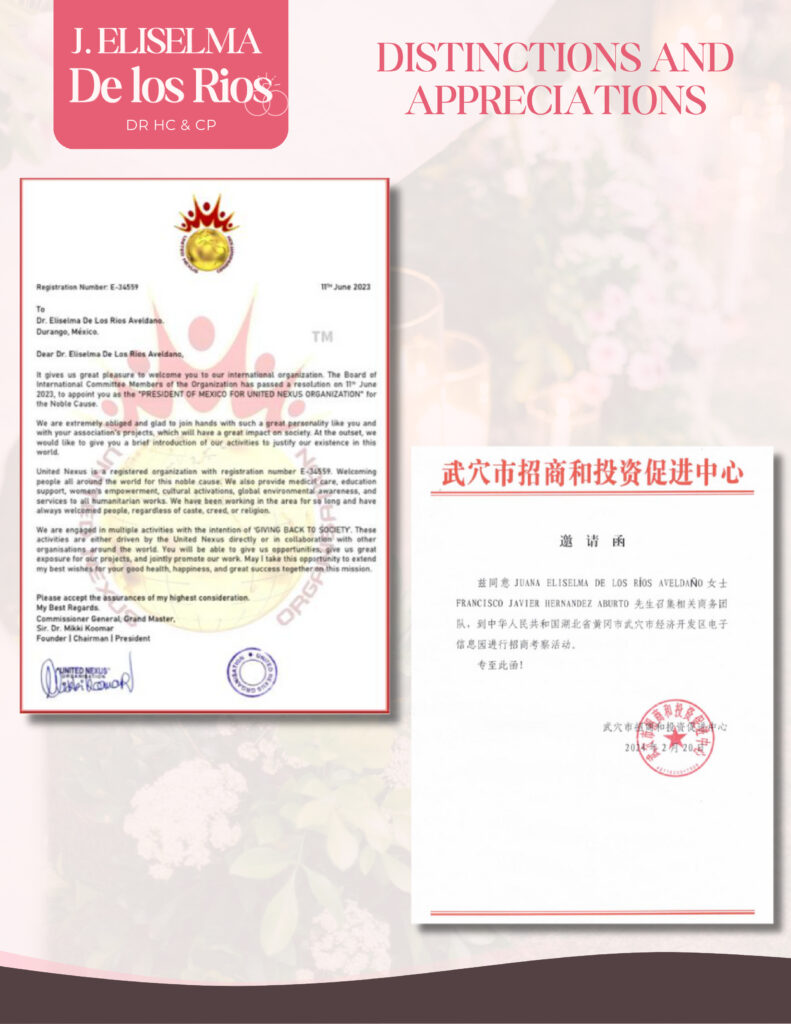 Director of Xtreme Industries from India to México 2023-2025 President of Mèxico for United Nexus Organization from India 2023-2026 Gobe award as outstanding Woman year 2023 Recognized as the 100 most influential Mexican leaders in Mexico in Leaders Magazine. special edition 2023 Wuxue City Investment Promotion CenterHereby consent convened relevant business teams to Wuxue Economic Development Zone, Huanggang City, Hubei Province, People’s Republic of China, to conduct investment inspection activities 2024.